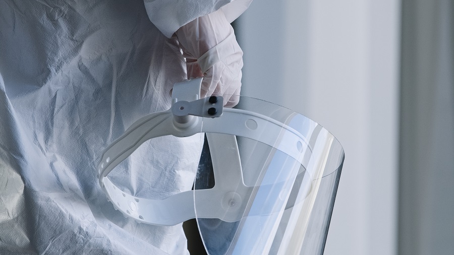 Unrecognizable doctor medical worker nurse practitioner scientist stands in clinic laboratory hospital at window wears white uniform and latex gloves holds in hand transparent protective face shield. High quality photo